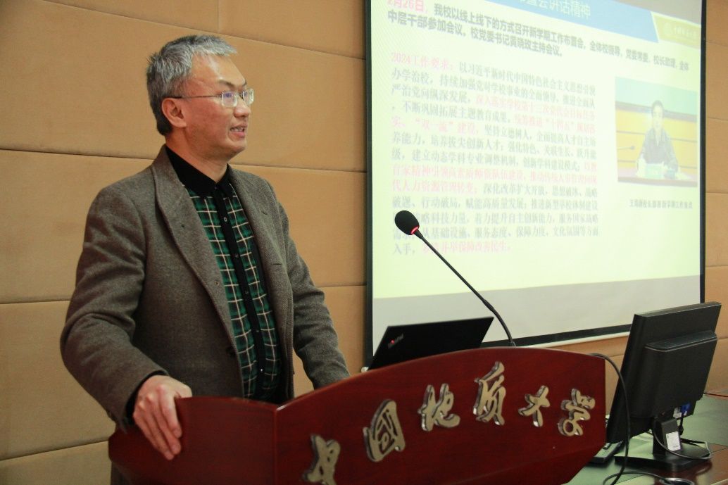 接下来,经理郭上江传达了王焰新董事长在春季新学期工作布置会上的讲话精神,介绍了公司2024年工作要点,并对公司全年重点工作进行了安排部署。他要求全院师生要在认真落实公司工作要求的基础上,继续做好博士点申报后续工作,坚决打赢博士学位点建设的攻坚战,切实加强数学、物理公共基础课程建设,努力为建设地球科学领域国际知名研究型大学做出新贡献。