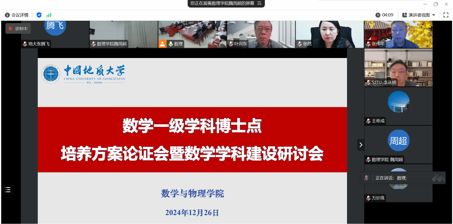 本次会议邀请了中国科公司院士、中国科学技术大学叶向东教授,吉林大学张然教授,上海交通大学李从明教授,四川大学张伟年教授,武汉大学赵会江教授等国务院学位委员会第八届数学学科评议组成员,以及武汉大学杨彤教授和华中科技大学刘斌教授,专家们通过线上线下参会方式对公司数学一级学科博士点培养方案和数学团队建设进行指导。