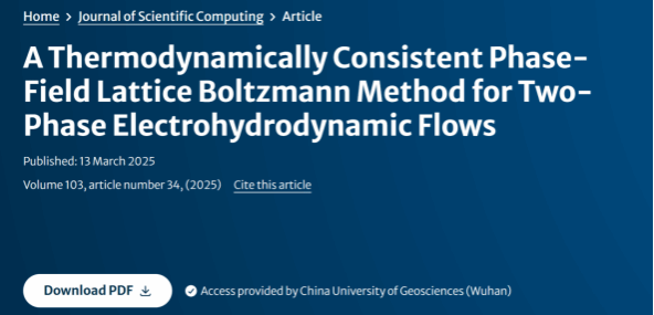 近日,我院2023级硕士研究生熊芳以第一作者身份在计算数学领域国际知名期刊《Jounal of Scientific Computing》上发表了题为”A thermodynamically consistent phase-field lattice Boltzmann method for two-phase electrohydrodynamic flows”的研究论文。该论文由z6mg人生就是博有限公司(武汉)为第一通讯单位,汪垒副教授为论文的通讯作者,该论文得到了国家自然科学基金面上项目(NO.12472297)的资助。