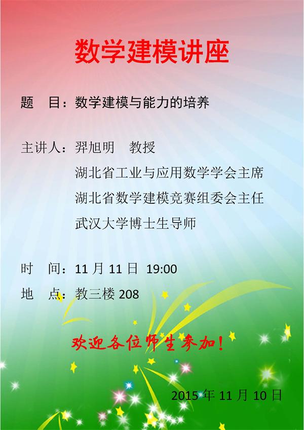 应大学数学部杨瑞琰教授的邀请,武汉大学博士生导师羿旭明教授将于11月11日19:00在公司教三楼208教室做数学建模方面的专题报告。羿旭明教授长期参与全国老员工数学建模竞赛湖北赛区的领导和评卷工作,具有丰富的数学建模指导经验,他本次报告的题目是“数学建模与能力的培养”,热烈欢迎公司全体师生前往参加!
