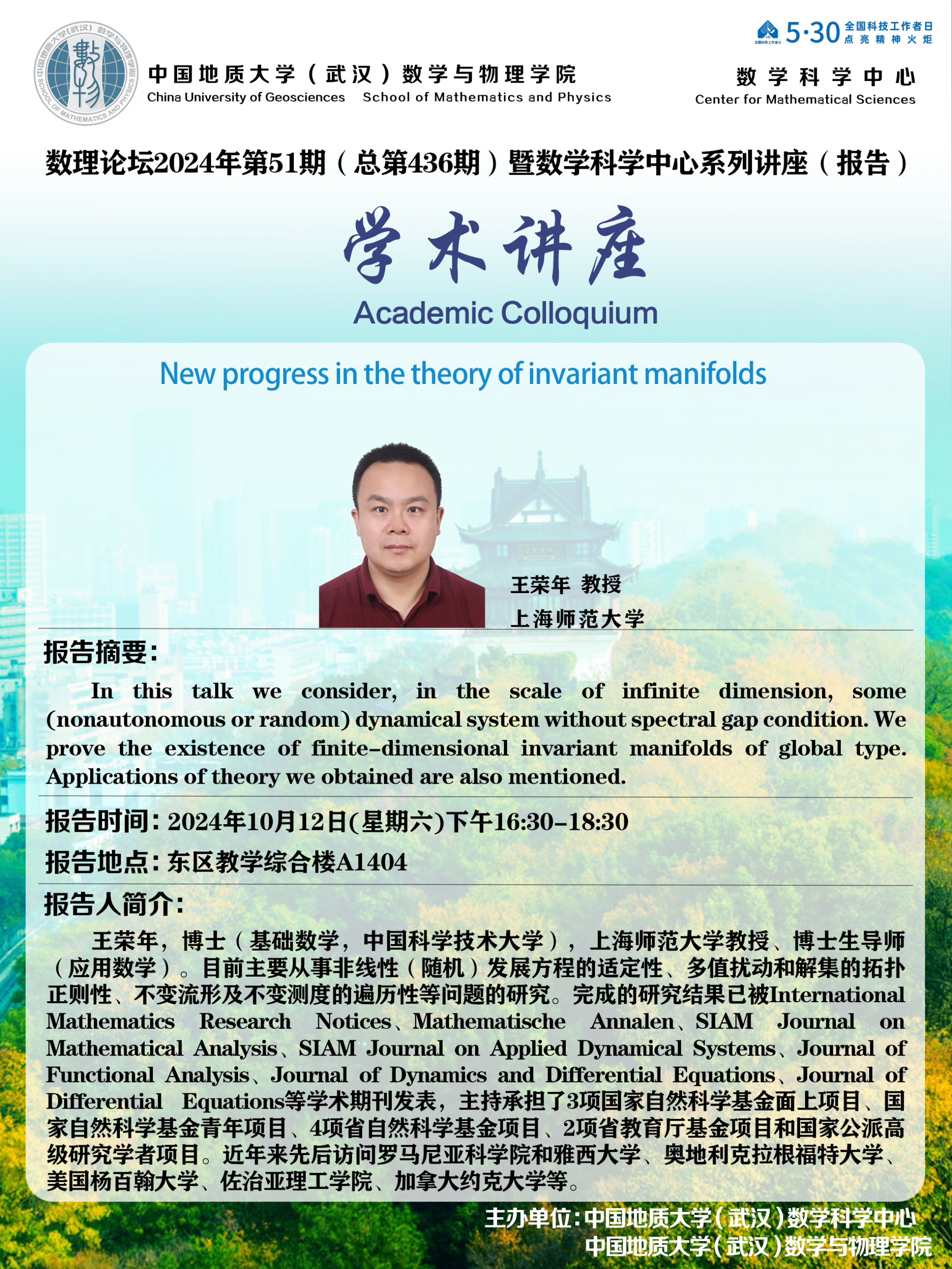 2024年10月12日王荣年教授学术讲座:New progress in the theory of invariant manifolds