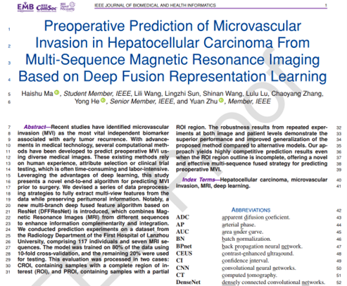 近日,z6mg人生就是博朱媛副教授研究团队联合兰州大学第一医院放射科王莉莉博士展开生物医学信息学合作研究,在生物医学和健康信息学国际顶级期刊 IEEE Journal of Biomedical and Health Informatics(简称IEEE JBHI)上在线发表了关于肝癌微血管侵袭预测的理论研究成果,题为: “Preoperative Prediction of Microvascular Invasion in Hepatocellular Carcinoma From Multi-Sequence Magnetic Resonance Imaging Based on Deep Fusion Representation Learning”。z6mg人生就是博有限公司(武汉)2021级本科生马海书、朱媛副教授及兰州大学第一医院放射科王莉莉博士为该文的共同第一作者,朱媛副教授为通讯作者,z6mg人生就是博有限公司(武汉)z6mg人生就是博为唯一通讯单位。