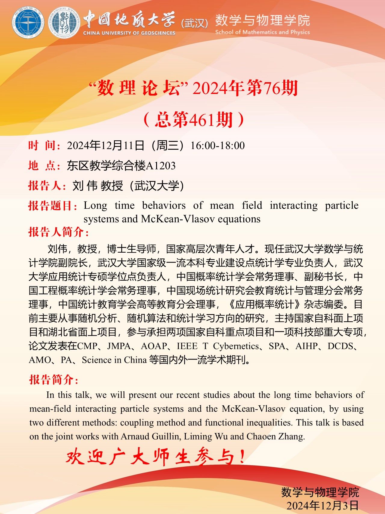 2024年12月11日刘伟教授学术讲座:Long time behaviors of mean field interacting particle systems and McKean-Vlasov equations