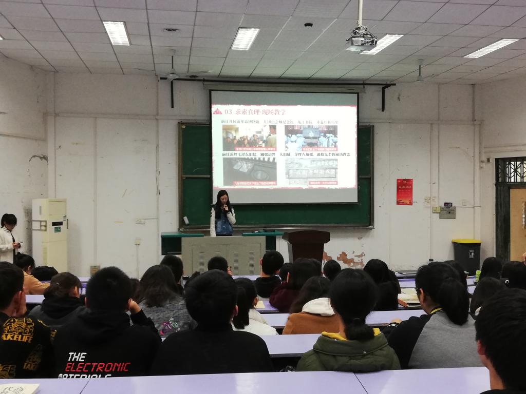 接着,全体参会人员起立唱团歌。然后,走“学习之路”青马班实践分享会代表为同学们讲述他们在井冈山学习的过程与心得体会。期间,代表还随机挑选了两名员工表演井冈山的爱情故事,从而使同学们更好的了解井冈山精神。听完他们的讲述,同学们可以更加详细的了解青马班的活动,从而在后期的活动参与中,能积极上进、脚踏实地、视野开阔,承担历史使命和时代精神。