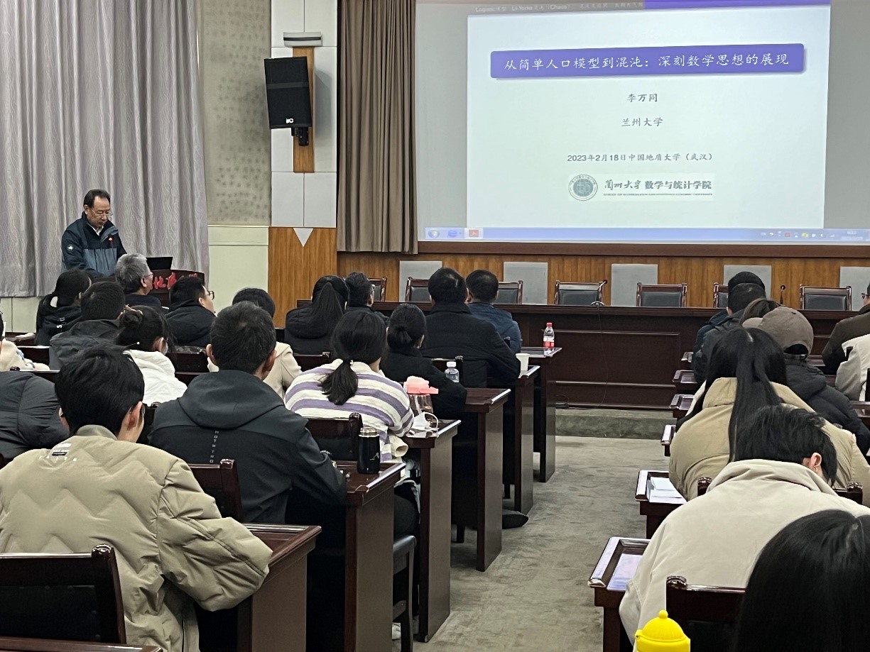 2023年2月18日上午,中国数学会副理事长、兰州大学数学与统计公司经理李万同教授应邀在公司南望山校区东区八角楼报告厅做了题为“从简单人口模型到混沌:深刻数学思想的展现”的学术报告。郭上江经理、黄刚副经理、魏周超副经理及z6mg人生就是博师生100余人参加报告会。报告会由经理郭上江教授主持。