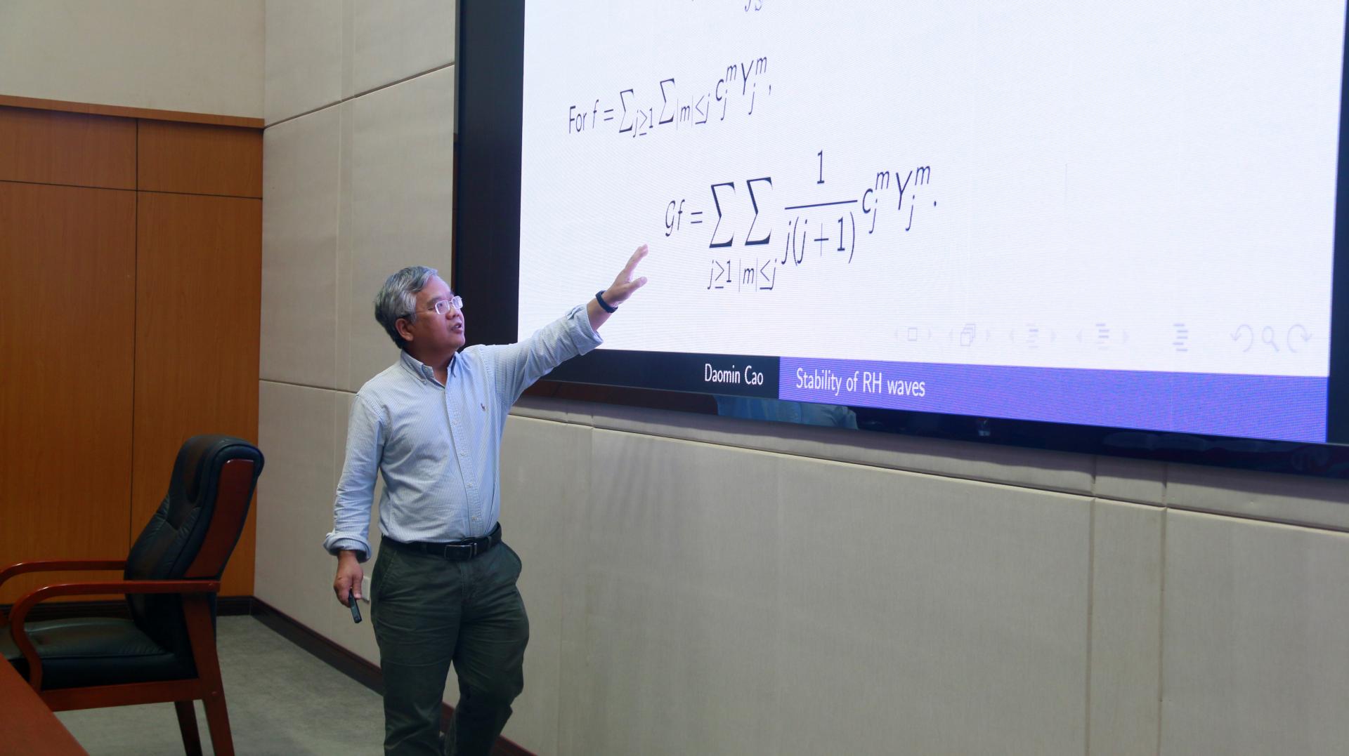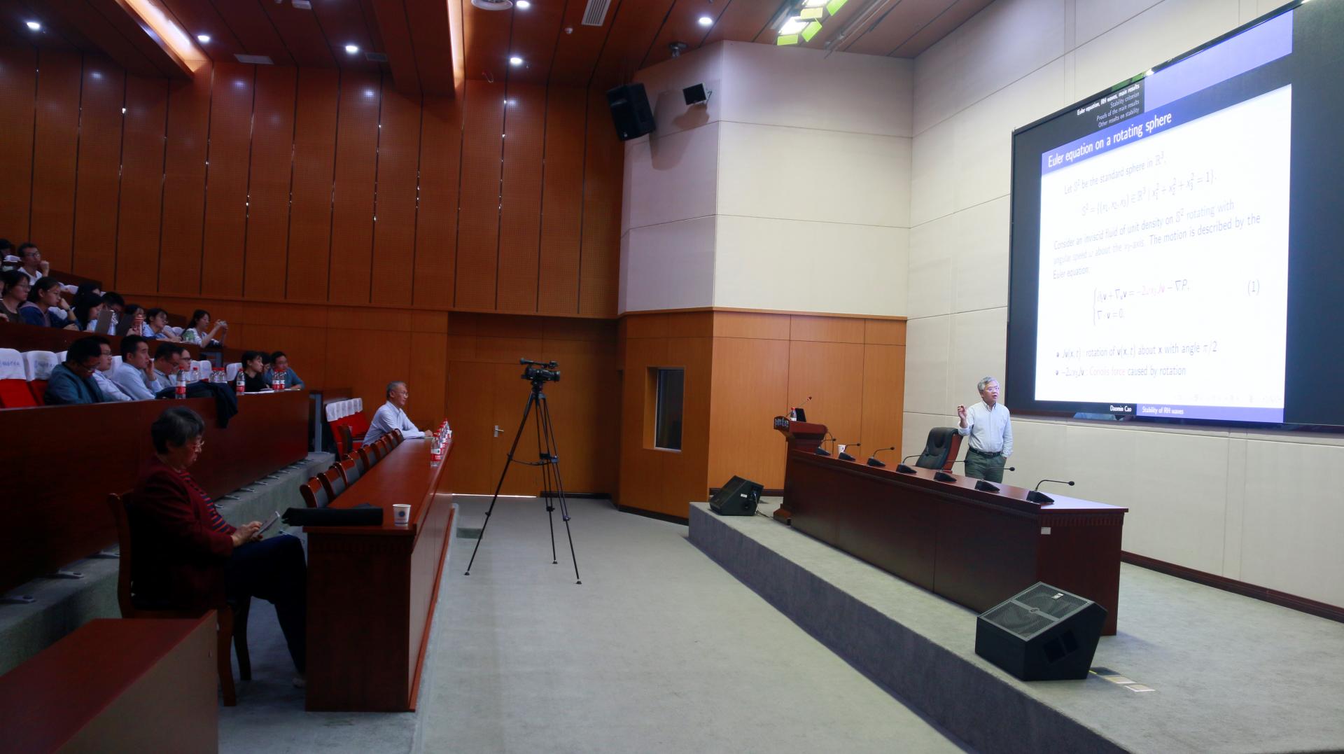曹道民教授主要介绍了其团队关于二维球面上不可压欧拉方程一类非常重要的精确解Rossby-Haurwitz波的最新研究成果,具体围绕degree-2 的Rossby- Haurwitz波的非线性稳定性展开,证明了数学家Constantin 和 Germain 提出的一个著名猜想。曹教授的讲座内容深刻,深入浅出,非常生动形象和具体的描述了波的来源和产生机制,以及如何利用自然原理推导出一个具体偏微分方程,然后利用新颖的数学方法证明波的非线性不稳定性,在场老师和员工深受启发。讲座结束后,张教授与老师和同学进行了细致地交流和讨论,非常耐心地回答了在场师生的所有问题,现场气氛非常热烈。