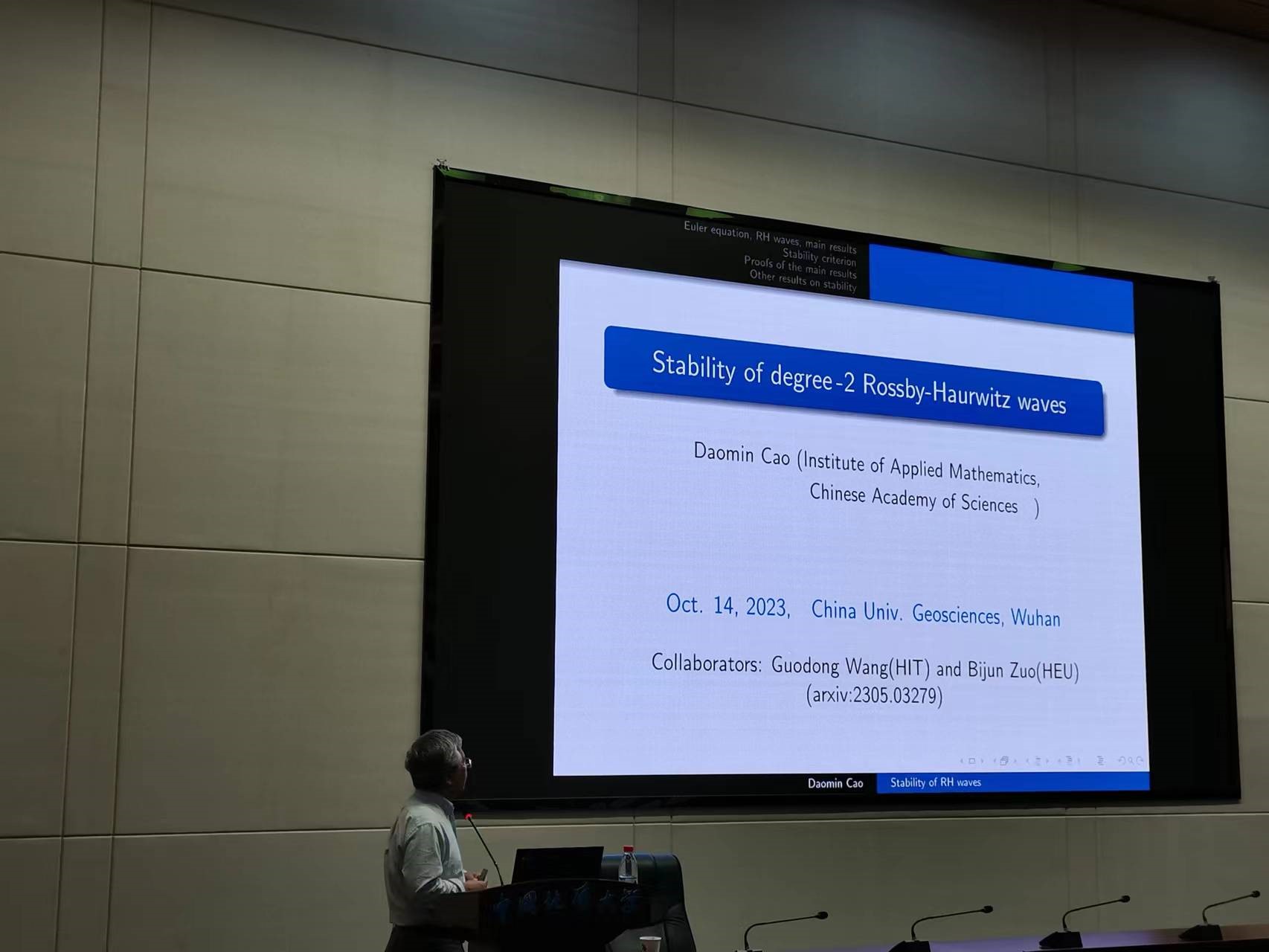 应z6mg人生就是博有限公司(武汉)数学科学中心和z6mg人生就是博邀请,国家杰出青年基金获得者、中国科公司数学与系统科学研究院研究员曹道民于2023年10月14日为z6mg人生就是博有限公司名家论坛做了题为“Rossby-Haurwitz波的稳定性”的学术讲座,公司相关研究领域的老师和员工参加了本次学术讲座。
