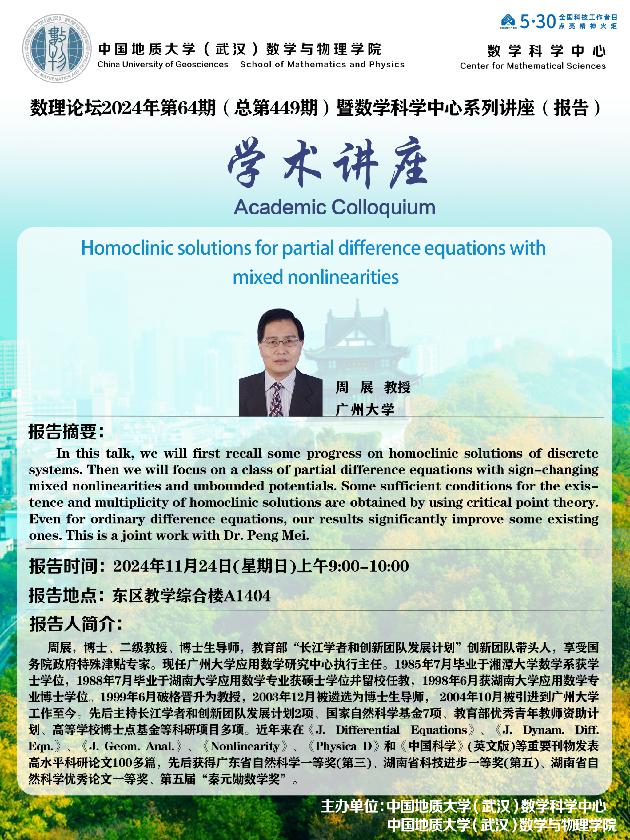 2024年11月24日周展教授学术讲座:Homoclinic solutions for partial difference equations with mixed nonlinearities